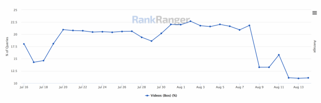 Как видно, сервис мониторинга позиций RankRanger зафиксировал почти двукратное падение показов видео в формате карусели в выдаче Google за последние дни. Показатель в 21% 8 августа упал до 11% через четыре дня – 12 августа.