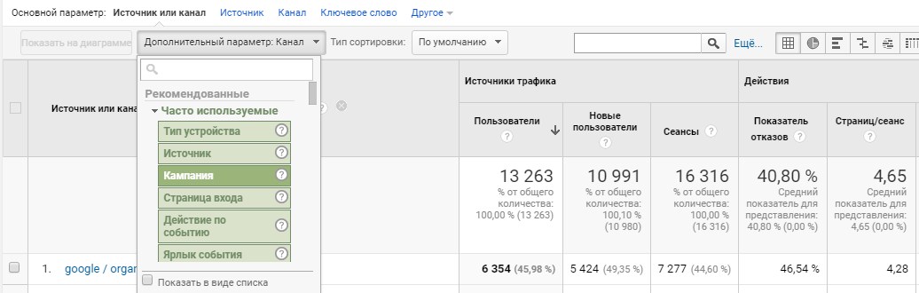 Чтобы оценить конкретный канал по рекламным кампаниям в разделе «Источник\канал», нужно кликнуть по нему и включить в Дополнительных параметрах пункт «Кампания». В таблице вы увидите трафик с показателями его качества, глубину просмотра, длительность сеанса пользователя и прочее.