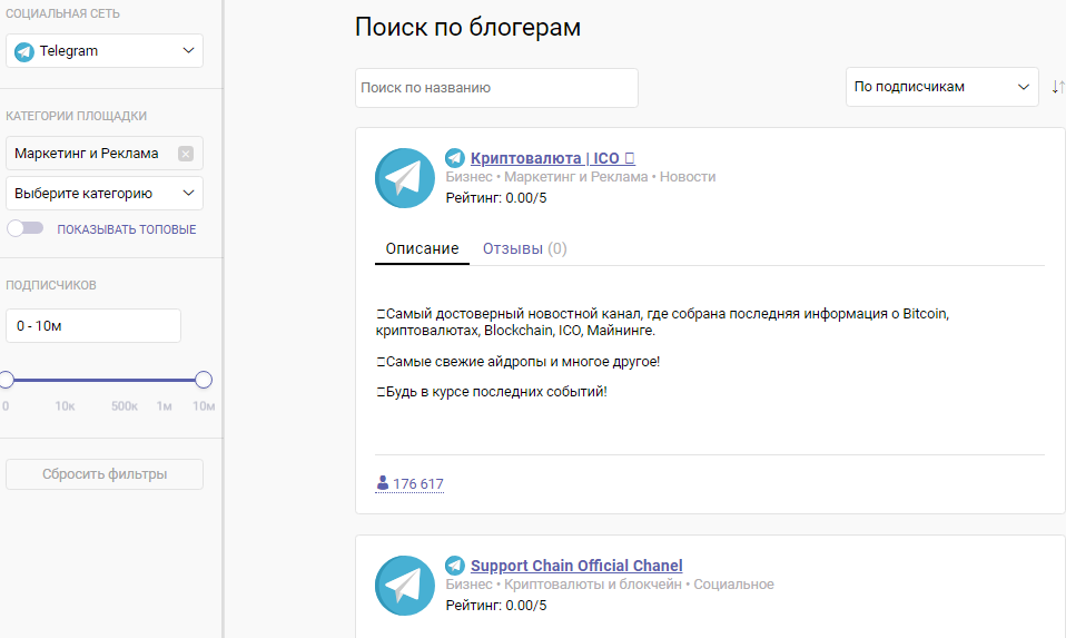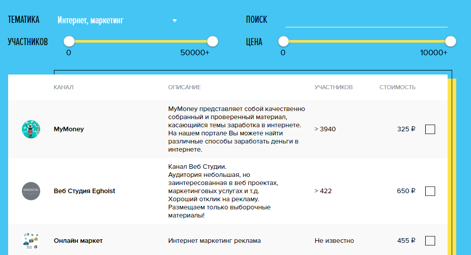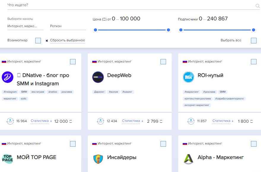 Биржа с каталогом каналов, можно фильтровать по категории, количеству подписчиков и отзывчивости - внутренней метрике сервиса. У каждого канала выводится статистика с общим количеством подписчиков. При сделках нужно заплатить комиссию 10%.