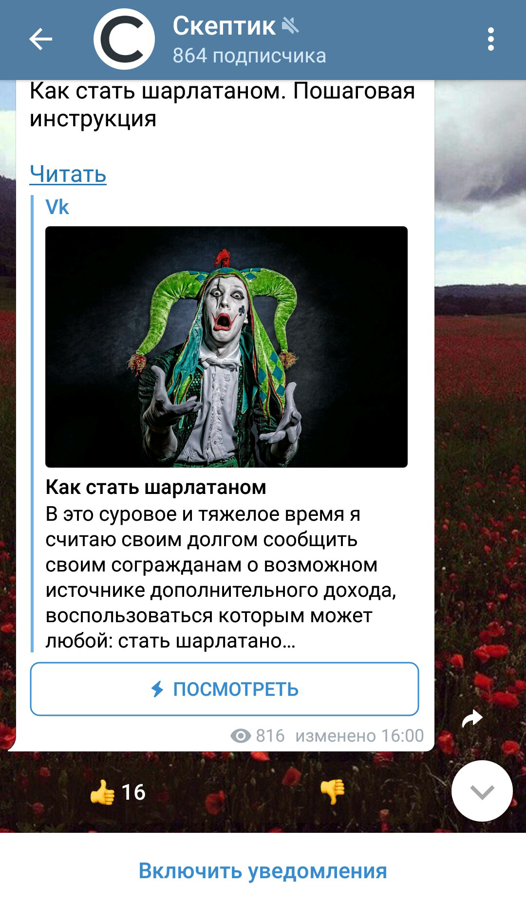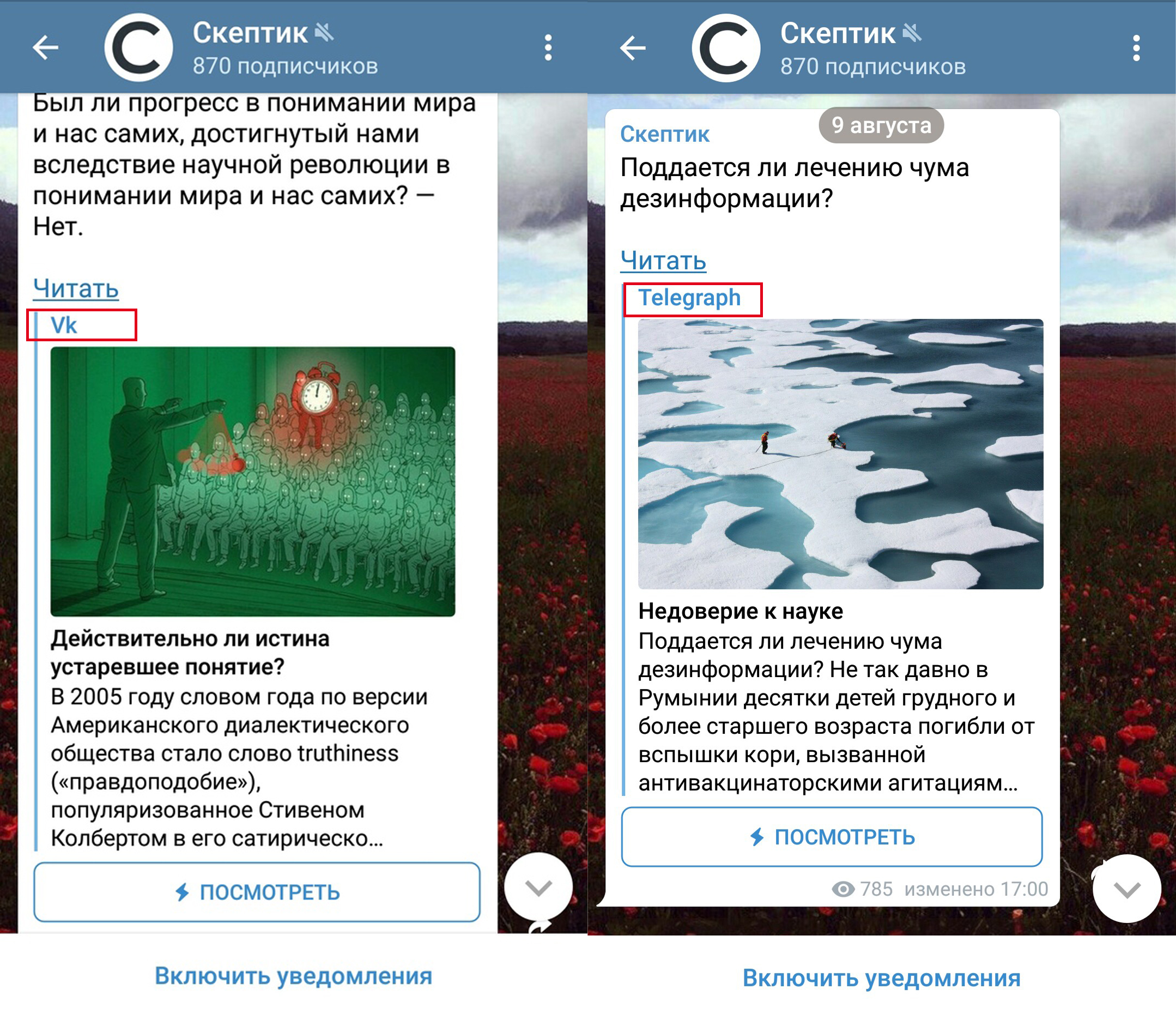 Если не хотите использовать ВКонтакте, можно создавать статьи во встроенном редакторе мессенджера — Telegraph. Они будут выглядеть так же — заголовок, описание из текста, иллюстрация и кнопка «Посмотреть». Различия только в подписи редактора.