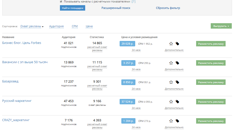 Каталог бесплатный, можно пользоваться без регистрации. Показывает каналы по теме, географии, числу подписчиков и цене рекламы, а также расширенную статистику по охвату и приросту подписчиков.
