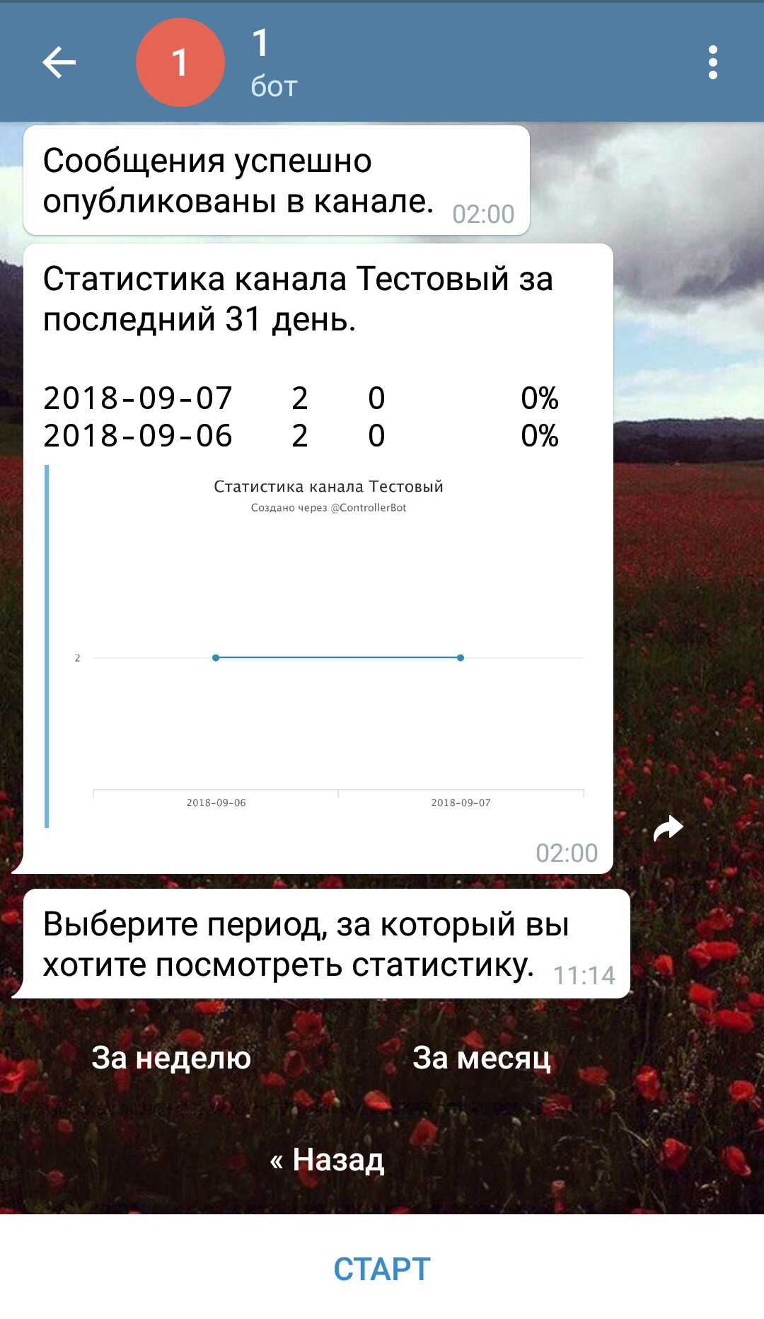Выводит статистику вступивших и вышедших пользователей тот же @ControllerBot через персонального бота, созданного для публикаций. Можно выбрать период, за который вам интересен график подписчиков.