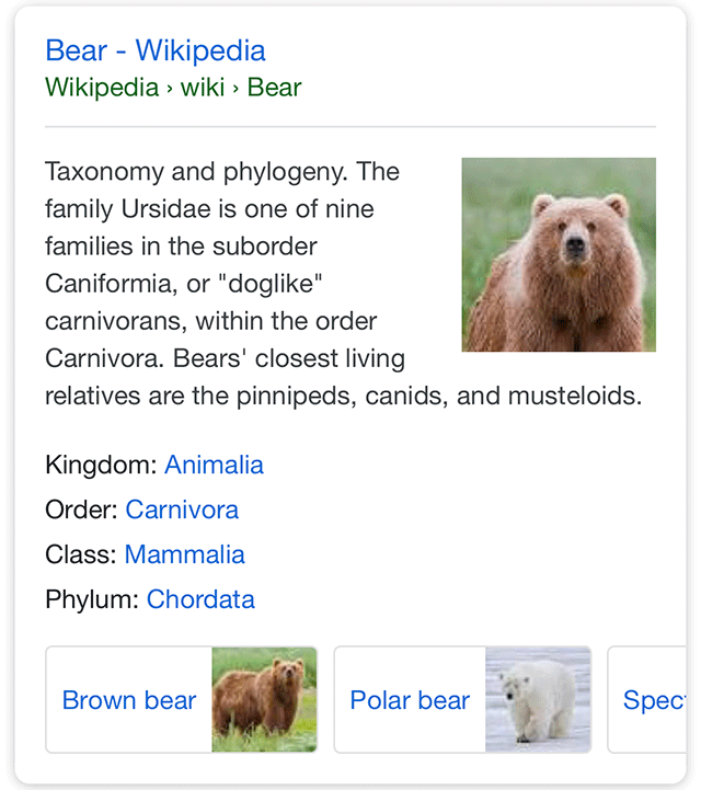 Первым о тестировании сообщил Барри Шварц. В ответ на поисковый запрос «bear» (рус. – медведь) карусель тематических ссылок внизу сниппета теперь содержит превью картинок: