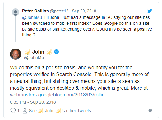 Оказалось, что это не так. Джон Мюллер в Твиттере сообщил, что сейчас поисковая система переводит в «Первичный мобильный индекс» только ресурсы, у которых мобильная и десктопная версии очень похожи: