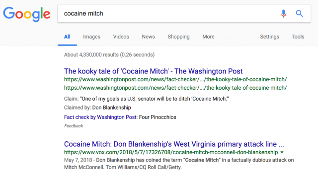 Google продолжает менять внешний вид сниппетов, теперь он дублирует основную ссылку. В ответ на поисковый запрос «cocaine mitch» Google показывает один сниппет с двумя аналогичными ссылками на статью в газете «The Washington Post»: