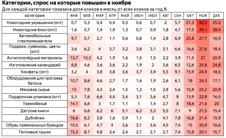 Ноябрьское похолодание диктует повышенный спрос на теплую одежду: дубленки, зимнюю обувь, термобелье и т.д. Из-за ухудшения погодных условий заметный интерес в этом месяце также наблюдается к антигололедным материалам, тепловым пушкам и автомобильным стеклоомывателям.