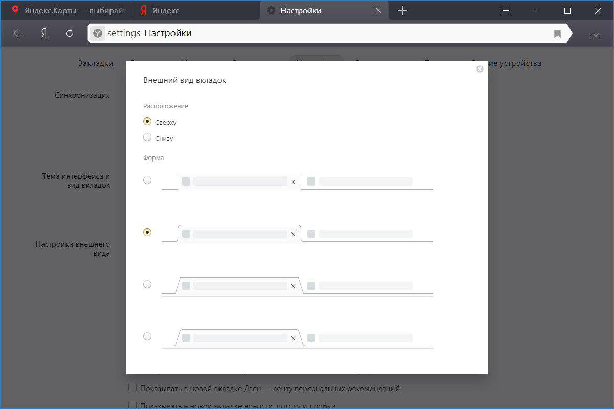 После обновления дизайна в Chrome/Chromium возникло много споров по поводу формы вкладок, Яндекс.Браузер предлагает выбрать место расположения - вверху или внизу браузера, и один из четырех дизайнов вкладок - прямоугольник или трапеция с острыми краями или со скругленными.