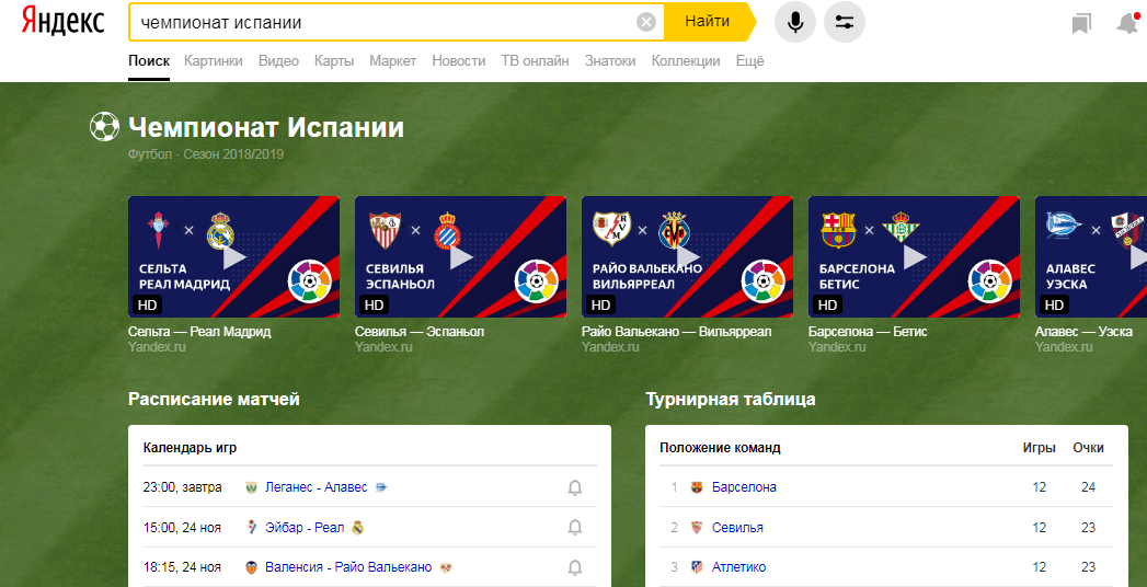 Иначе выглядит и выдача по спортивным запросам: стилизованный результат с актуальными матчами появляется прямо на странице выдачи.