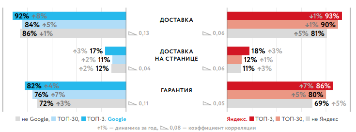 Связь с попаданием в топ-30 и корреляция с позицией для информации о гарантии и сервисе есть в обоих поисковиках.