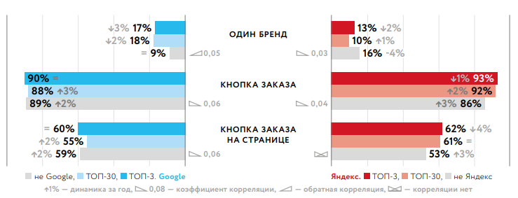 Статистика показывает связь наличия кнопки заказа на странице с попаданием в топ-30 Яндекса и позицией в Google.
