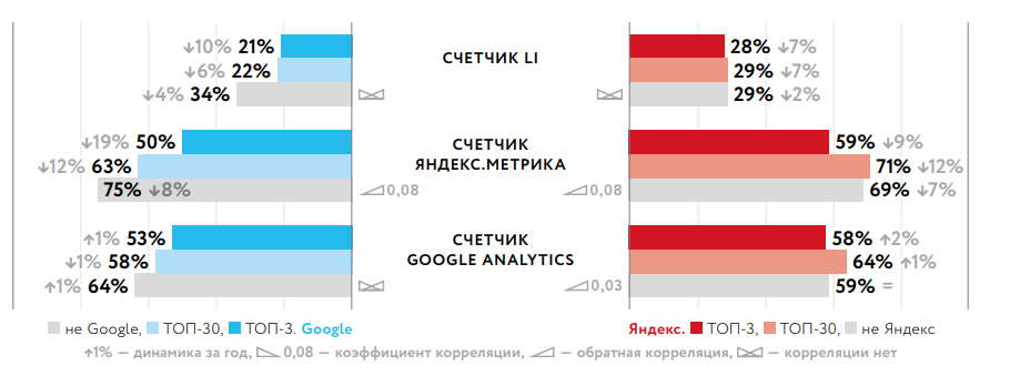 Поисковикам не важно, стоят ли на сайте счетчики Google Analytics, Яндекс.Метрики, Mail.ru, Rambler Top100 и LiveInternet, корреляции нет.