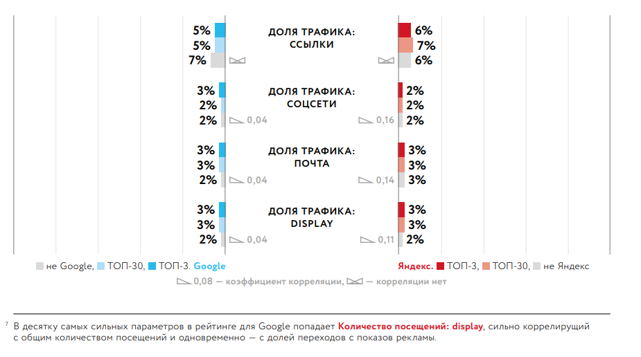Исследователи оценили топ выдачи и топ-30 в Яндекс и Google, вывели корреляцию между попаданием в топ и разными факторами оптимизации ресурса. Корреляция не означает обязательной причинно-следственной связи, но она показывает, какие факторы стоит взять во внимание при оптимизации ресурса.