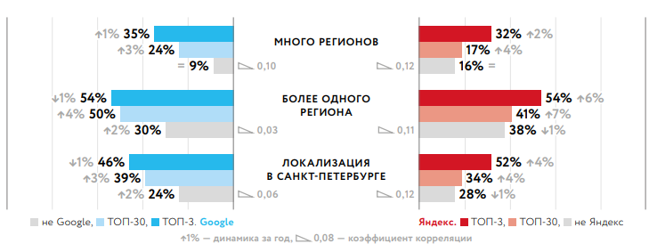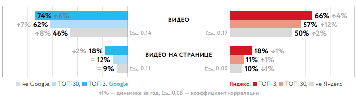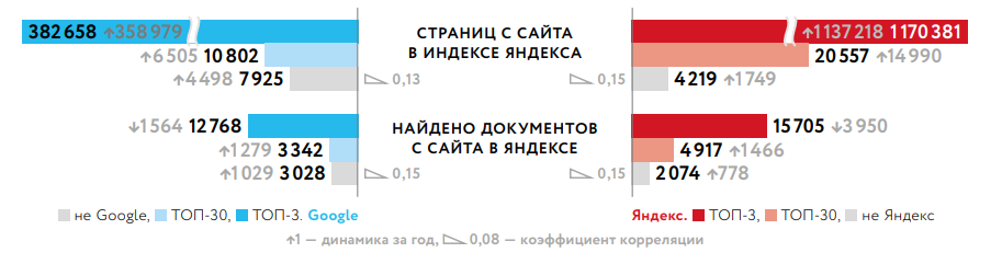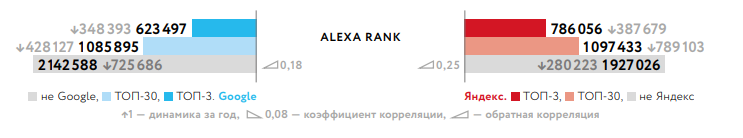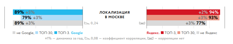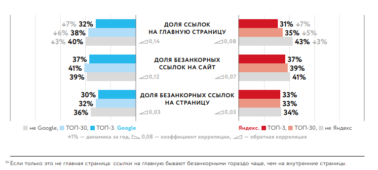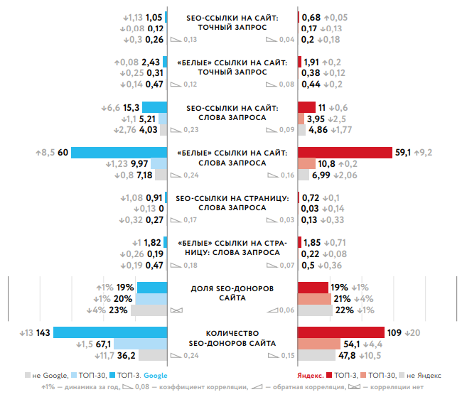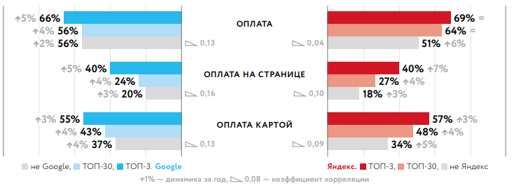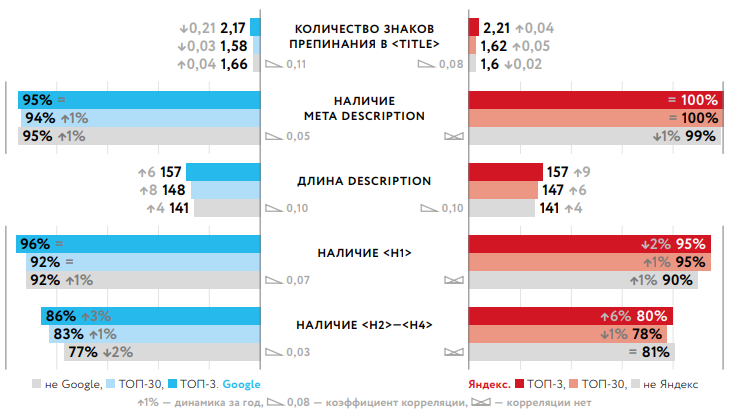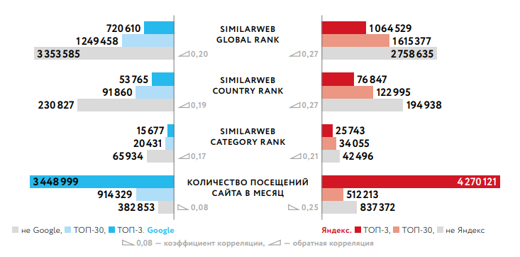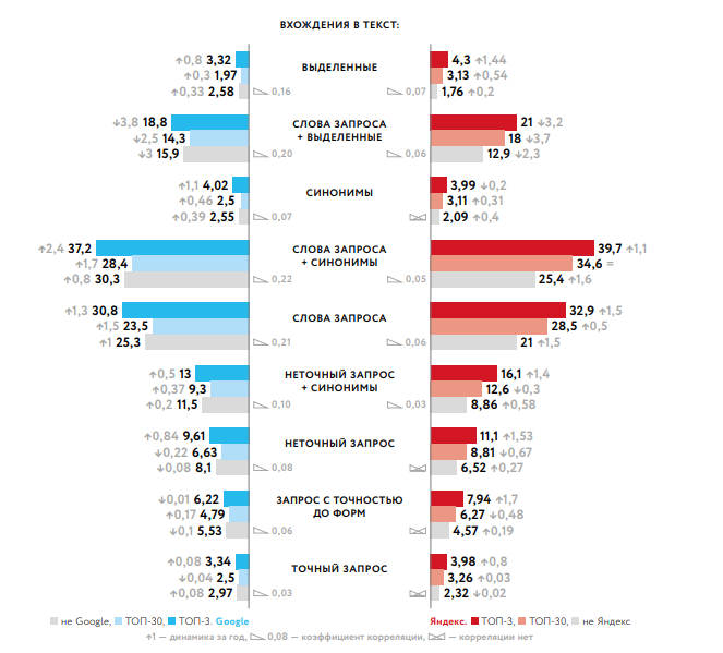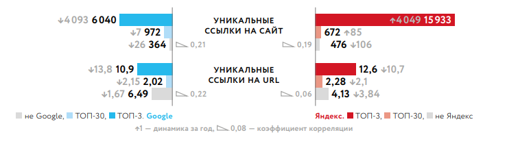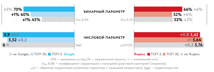Исследователи иллюстрируют результаты анализа диаграммами, которые построены отдельно для Google и Яндекс. На каждой приводят данные по параметрам для топ-3, топ-30 и остальных результатов. В диаграмме отображены изменения за год и коэффициент корреляции, она может быть прямой и обратной.