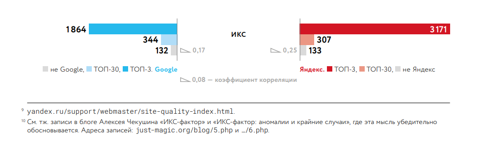Яндекс заявляет размер аудитории как фактор, среди прочих определяющий ИКС. По результатам исследования ИКС сильно коррелирует с общим трафиком. Анализ показал связь ИКС и попадание в лидеры выдачи.