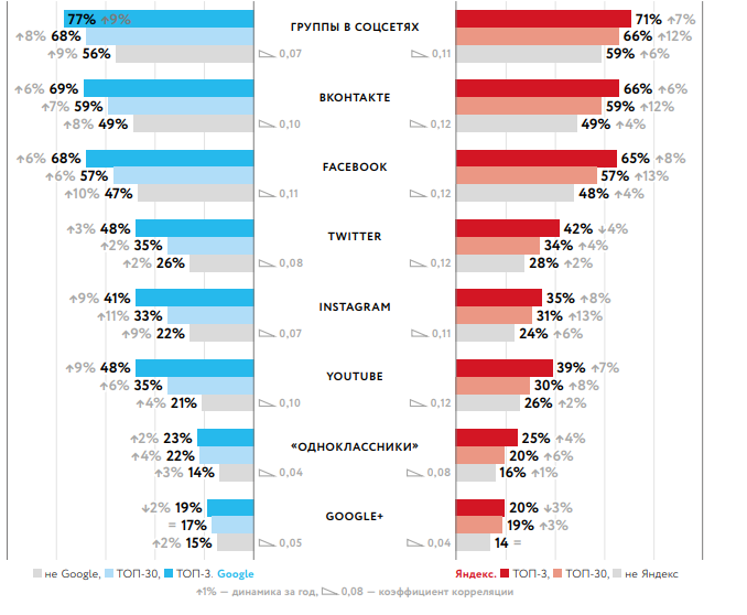 Две трети сайтов из топ-30 обоих поисковиков имеют группы в соцсетях, в топ-3 их еще больше. Корреляции с позицией усиливаются. Наибольшая связь с социальными сетями ВКонтакте и Facebook, Google+ закрывается, поэтому теряет значение.