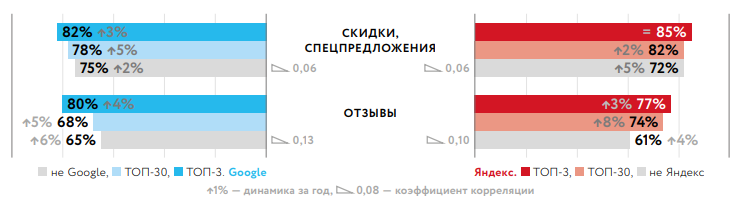 У акций и скидок на странице есть сильная корреляция с позицией в Google и связь с позицией и попаданием в топ Яндекса.