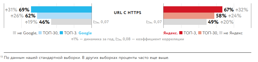В топ-3 и топ-30 поисковиков становится больше сайтов с HTTPS, особенно в выдаче Google.