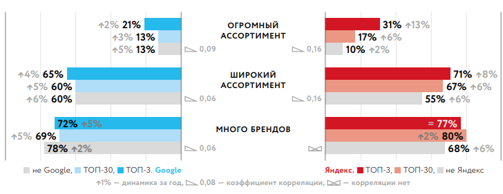 В Яндексе у огромного ассортимента очень сильная корреляция и с позицией и с попаданием в топ-30, у Google она немного слабее.