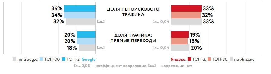 В Яндексе сайты-лидеры имеют больше непоискового трафика, чем ресурсы на нижних позициях. В Google корреляции с непоисковым трафиком не выявлено.