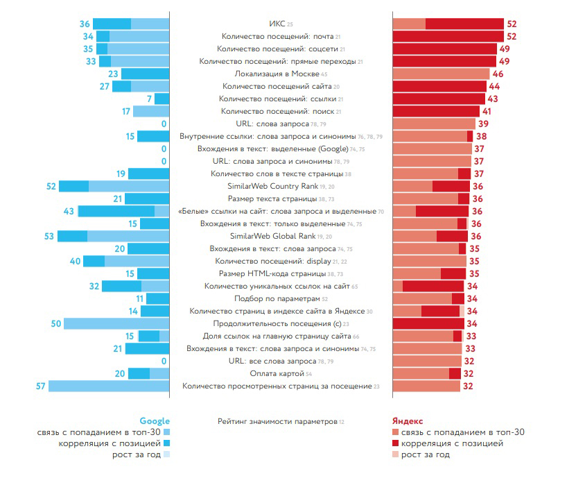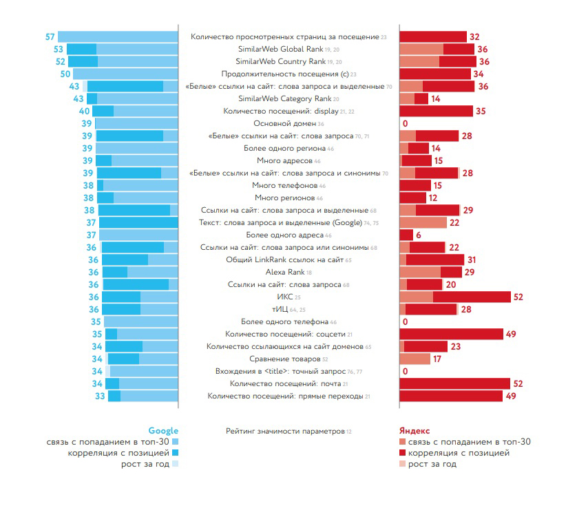 Исследователи из Лаборатории составили топ-70 параметров для обоих поисковиков, которые больше других повлияли на ранжирование ресурсов.