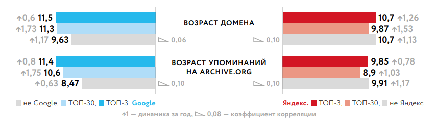 Среди оптимизаторов популярно мнение, что поисковики лучше относятся к сайтам с авторитетными старыми доменами. Это подтверждается исследованием: средний возраст домена из топ-30 Яндекса — 9,76 лет, из топ-30 Google — 11,3.