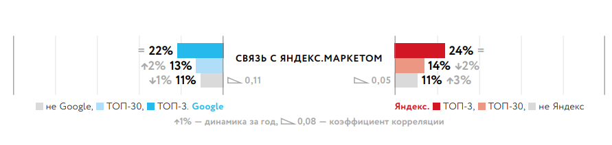 Исследователи предположили, что присутствие в Яндекс.Маркете положительно влияет на отношение поисковика к сайту. Это подтвердилось анализом, но похожую корреляцию показал и Google, что странно: скорее всего дело не в присутствии на площадке сервиса.