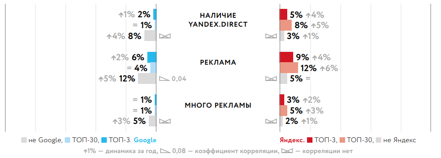 Связи между рекламой на сайте и позицией в выдаче не обнаружено. Сайтов с рекламой чуть больше в Яндексе, но это потому, что в выдаче Яндекса больше агрегаторов.