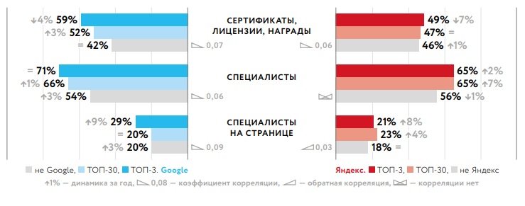 Информация о специалистах компании, предоставляющих услуги, есть примерно на двух третях сайтов. В обоих поисковиках есть корреляция с попаданием в топ, в Google есть связь и с позицией.