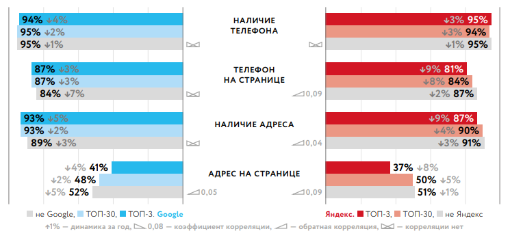 Корреляцию с позицией в Google и с попаданием в топ Яндекса показывает только указание на странице e-mail. Но если вы обычно созваниваетесь с клиентами, поместите на каждую страницу телефон.