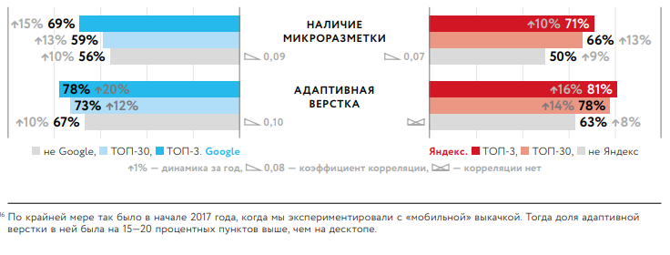В Яндекс и Google наличие микроразметки коррелирует с позицией и попаданием в топ. Schema.org и Open Graph показали корреляцию для топа и позиций в Яндексе и для позиций в Google. В результатах Google встречалась разметка Microformats.