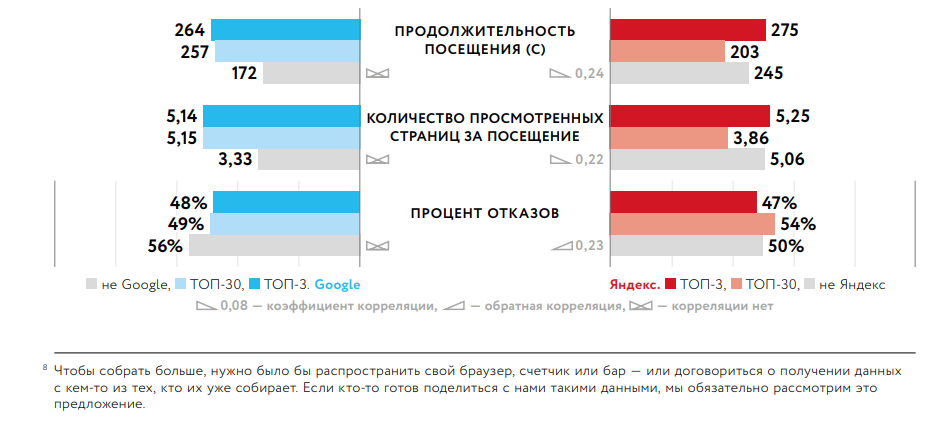 Исследователи рассматривали только продолжительность сеансов, количество просмотренных пользователем страниц и долю отказов, другие поведенческие факторы для анализа недоступны.