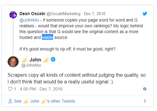 «Если кто-то копирует вашу страницу слово в слово и об этом узнает Google – улучшит ли это позиции вашего сайта в результатах поиска? Логика заключается в том, что Google в таком случае должен считать оригинальный контент более трастовым и конкурентным».