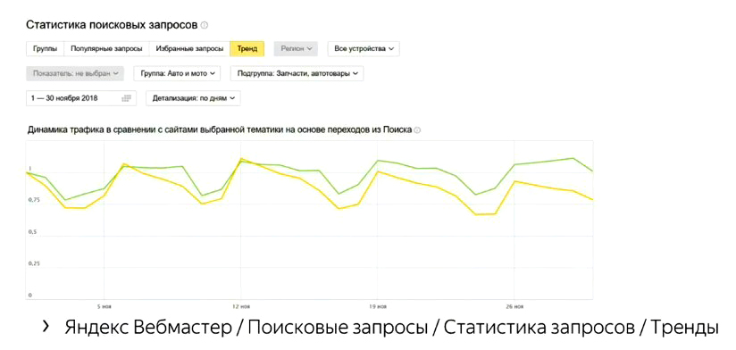 Яндекс обновил раздел «Тренды» в Вебмастере. Теперь вне зависимости от тематики сайта можно сравнить результаты по любым трендам в любых категориях. Категории взяли из структуры сервиса «Яндекс.Радар». Линии тренда Яндекс рисует по количеству поискового трафика на сайты, входящие в категорию.