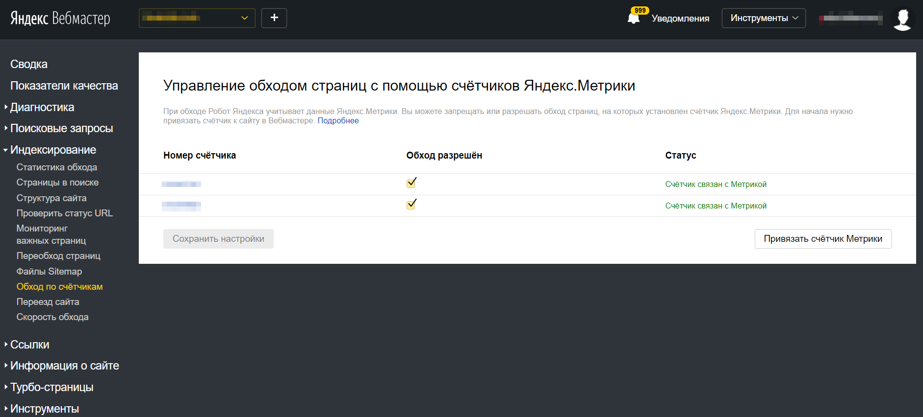 - Привязать счетчик к сайту: в настройках счетчика запросить привязку к Вебмастеру или запросить привязку в самом Вебмастере и подтвердить ее в Метрике. В любое время привязку можно отменить.
