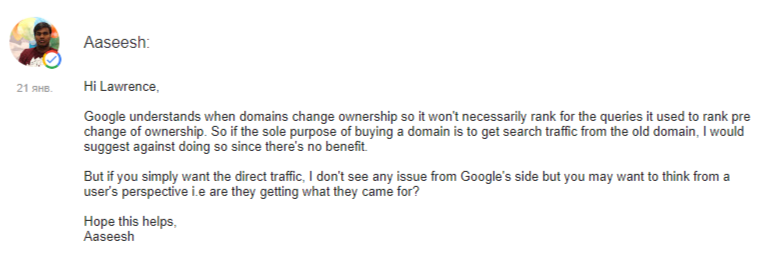 Не стоит полагаться на сохранение показателей сайта после покупки чужого домена. Такое предупреждение на Форуме помощи веб-мастерам сделал один из сотрудников Google: