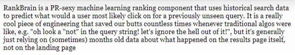 «RankBrain – сексуальный элемент алгоритма ранжирования на базе машинного обучения, который использует исторические данные для предсказания наиболее вероятного клика пользователя на странице выдачи по запросу, с которым Google никогда прежде не встречался.