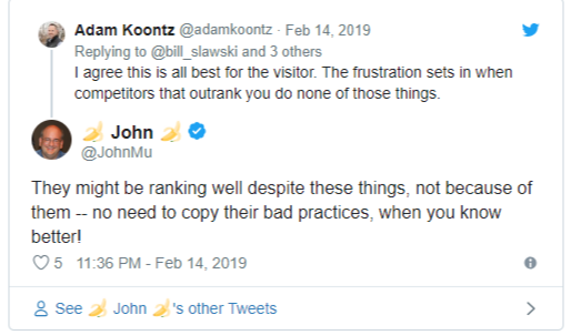Вдобавок Джон пошутил: как в принципе юридическая компания может интересоваться нарушением правил?! Шутки шутками, но трудно не согласиться с такими вопросами веб-мастеров, которые с отчаянием наблюдают, как нарушение установок Google ведет к лучшему ранжированию в SERP.