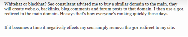 «Мой SEO-консультант посоветовал мне приобрести для нового сайта доменное имя, которое похоже на мой основной ресурс. После этого он со своей командой сеошников планирует начать проставлять бэклинки на этот новый домен со страниц форумов, в комментариях блогов и т.д. Моя же задача затем с помощью 301 редиректа перенаправлять ссылочный вес с нового сайта на основной. По словам моего специалиста, в наши дни большинство сайтов поднимают свои позиции в Google именно таким образом.