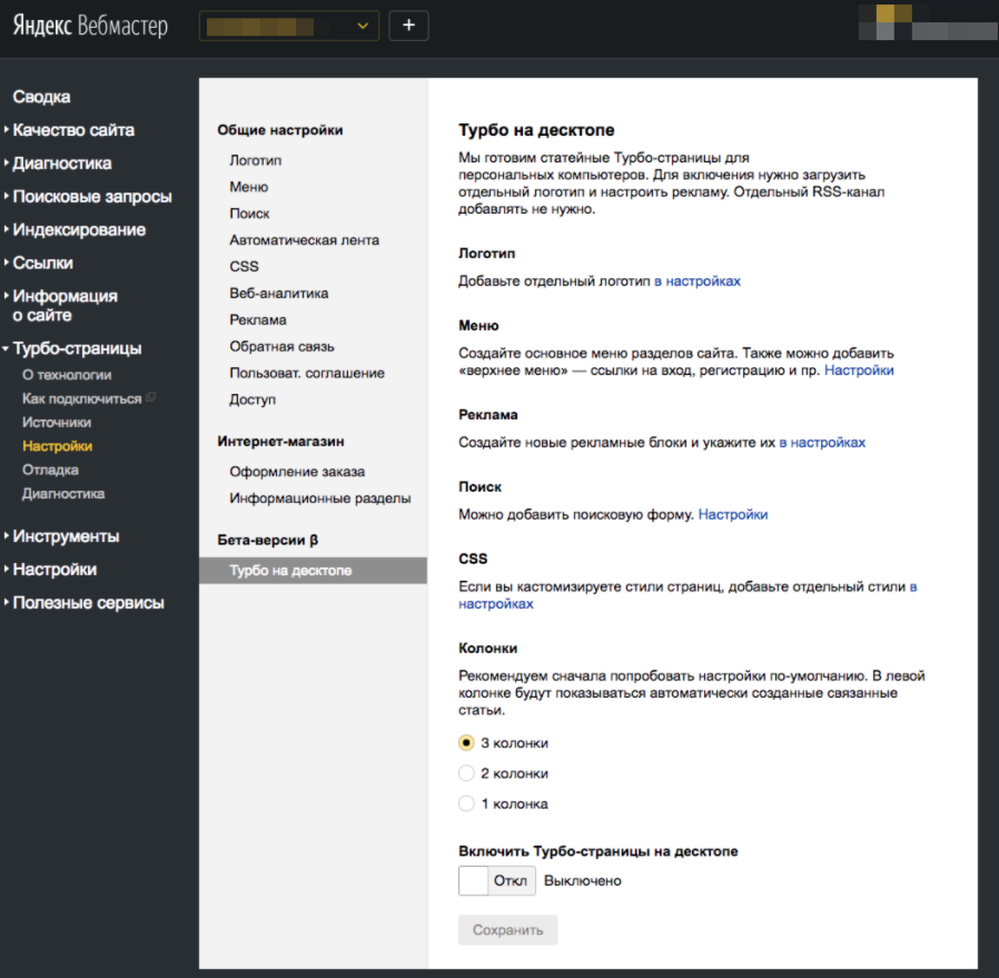 В Вебмастере работать с Турбо для экранов компьютера можно в разделе Настроек Турбо-страниц: