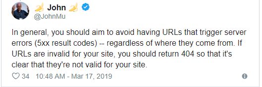 «Необходимо избегать ситуации, когда страница веб-ресурса отдает код ошибки 5xx (проблема на стороне сервера). Если URL более не существует, используйте ошибку 404. Так мы узнаем, что страницы больше нет. Серверная ошибка URL 5xx таких сведений не передает».