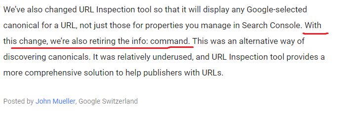 Поисковик продолжает отказываться от популярных поисковых операторов. Вчера в блоге для веб-мастеров Google сообщил, что следующей такой командой станет «info:».