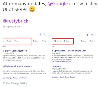 Первыми о новом внешнем виде меню поиска сообщили зарубежные сеошники. Теперь каждый фильтр («Новости», «Карты», «Покупки» и др.) сразу под строкой поиска дополняется соответствующей иконкой: