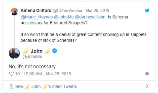 Не лишним будет знать, что несколько лет тому назад у Джона было иное мнение. По его словам, использование структурированных данных Schema.org могло помочь материалам сайта попасть в блок с ответами в Google SERP. Примерно тогда же Гари Илш отбросил такую взаимосвязь.