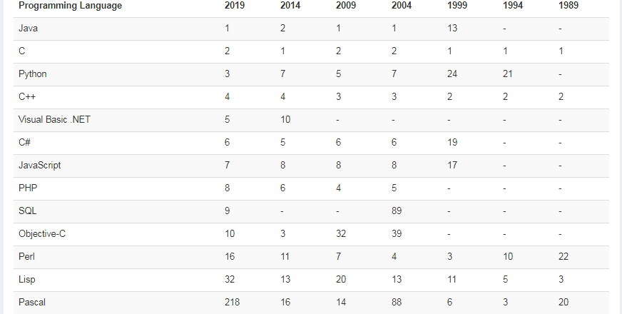 Авторы индекса составили таблицу с десяткой лучших языков программирования за семь лет, данные считали в среднем по месяцам за год. Лидеры списка совпадают с лидерами июля 2019 — это Java, C и Python.