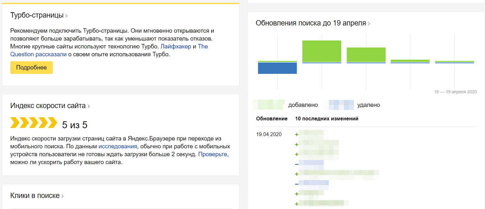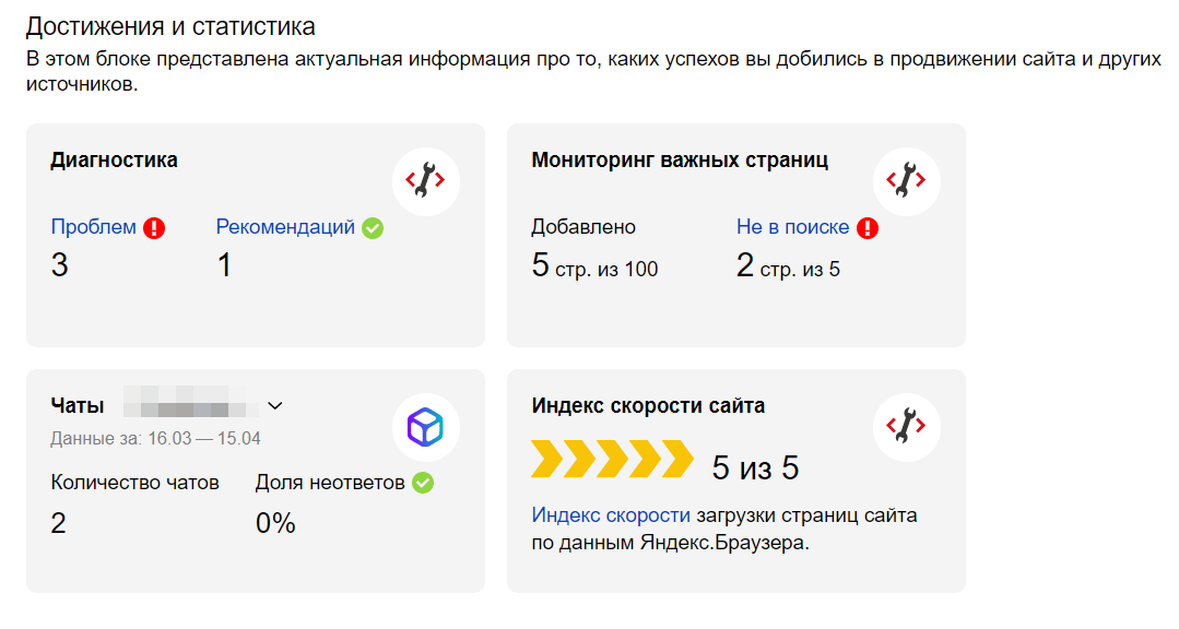 Напомним, в этом блоке отображается актуальная информация об успехах в продвижении ресурса. Новым элементом блока стал «Индекс скорости сайта»:
