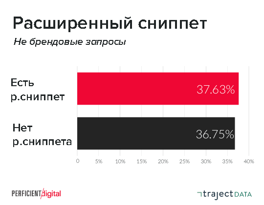 Для обычных запросов общий процент кликов примерно одинаков — для выдачи с расширенным сниппетом и без него. Мы ожидали, что при наличии такого сниппета кликов будет намного меньше, потому что часть пользователей получит свой ответ, но оказалось, что процент кликов даже чуть выше. Они привлекают внимание и побуждают продолжить чтение на сайте, если не весь нужный контент влез в сниппет.
