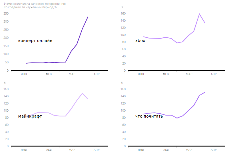 Пребывание дома вынуждает людей больше смотреть онлайн. Как результат, существенно возросла популярность трансляций музыкальных концертов. Стабильно высоким остается спрос на видеоигры. Самоизоляция заставила многих вспомнить о незыблемой пользе книги. Всплеск поискового запроса «что почитать» тому подтверждение.