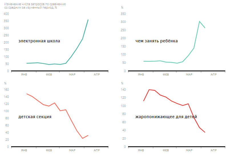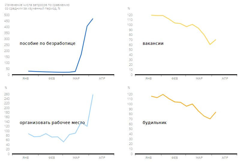 Потеря работы вынуждает многих активно искать информацию о пособиях по безработице. С другой стороны, поиск новых вакансий наоборот упал. Очевидно, что соискатели не верят в возможность трудоустроиться во время карантина. Вчерашние офисные работники, которые осваивают удаленку, вводят поисковые запросы вроде «организовать рабочее место».