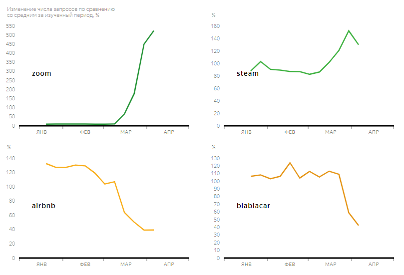 Инструментарий для удаленной работы или развлечений сейчас на пике популярности. Сервисы, связанные с туризмом и передвижением, увы, на дне.