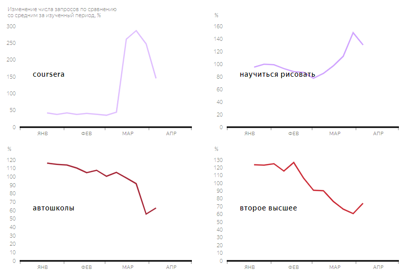 Март – время активного поиска информации о самообразовании. Апрель – падение интереса к образованию на дому. Причин две: одни нашли то, что искали, а другие разуверились в том, что образование на удаленке может быть качественным. Рухнувший в прошлом месяце интерес к автошколам и второму высшему образованию постепенно восстанавливается. Самоизоляция рано или поздно, но обязательно закончится.